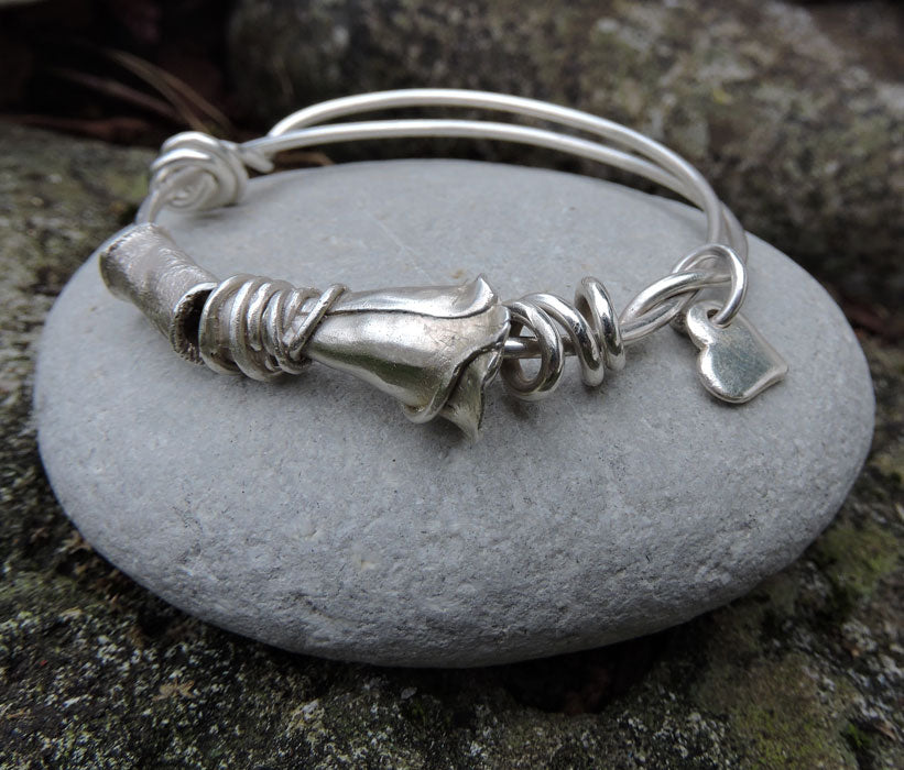 One size fits all ... These bangles are made to be eased out, to fit over the knuckles, and then squeezed back in, to fit snugly round the wrist. Available with or without a heart charm. Each bangle is handmade, to order.