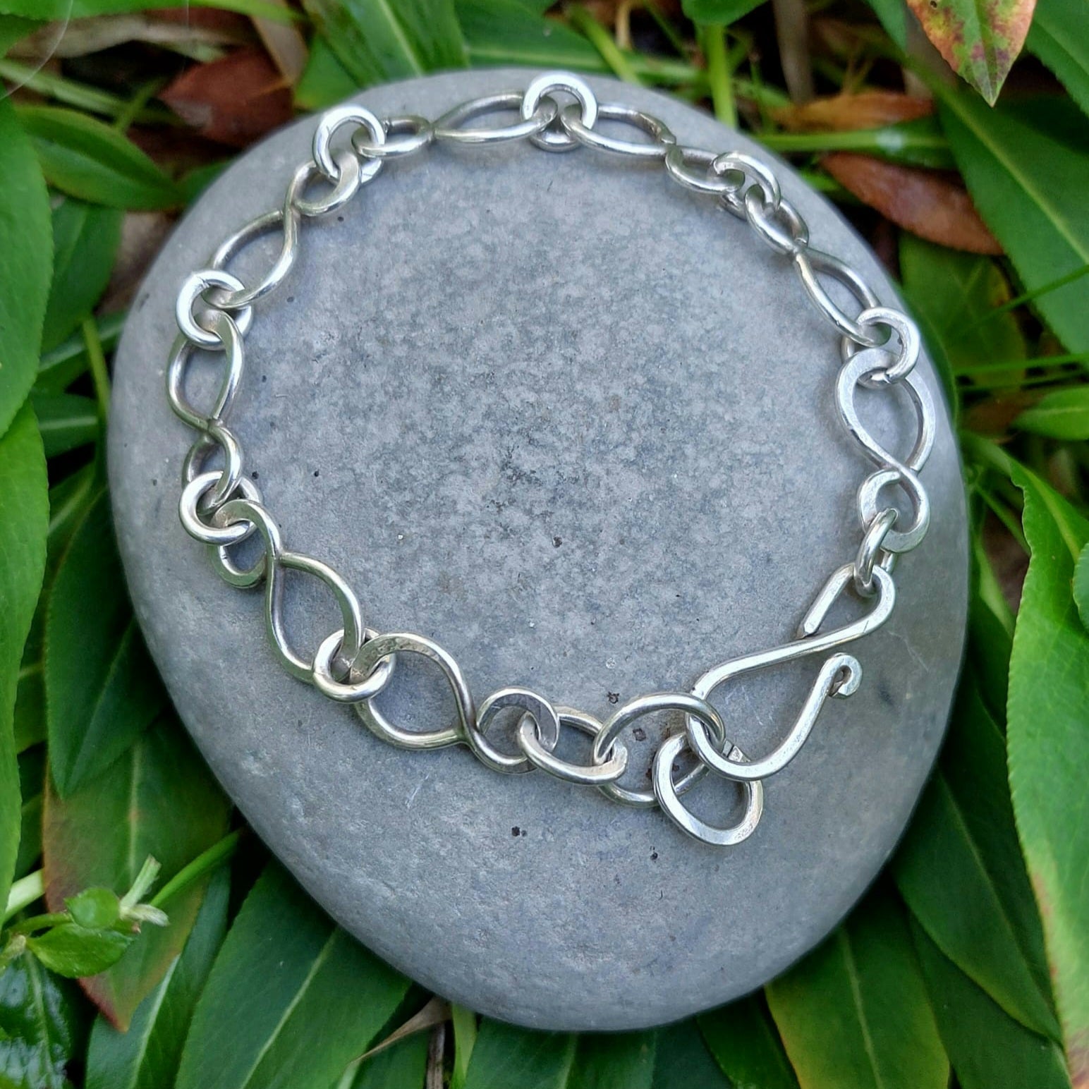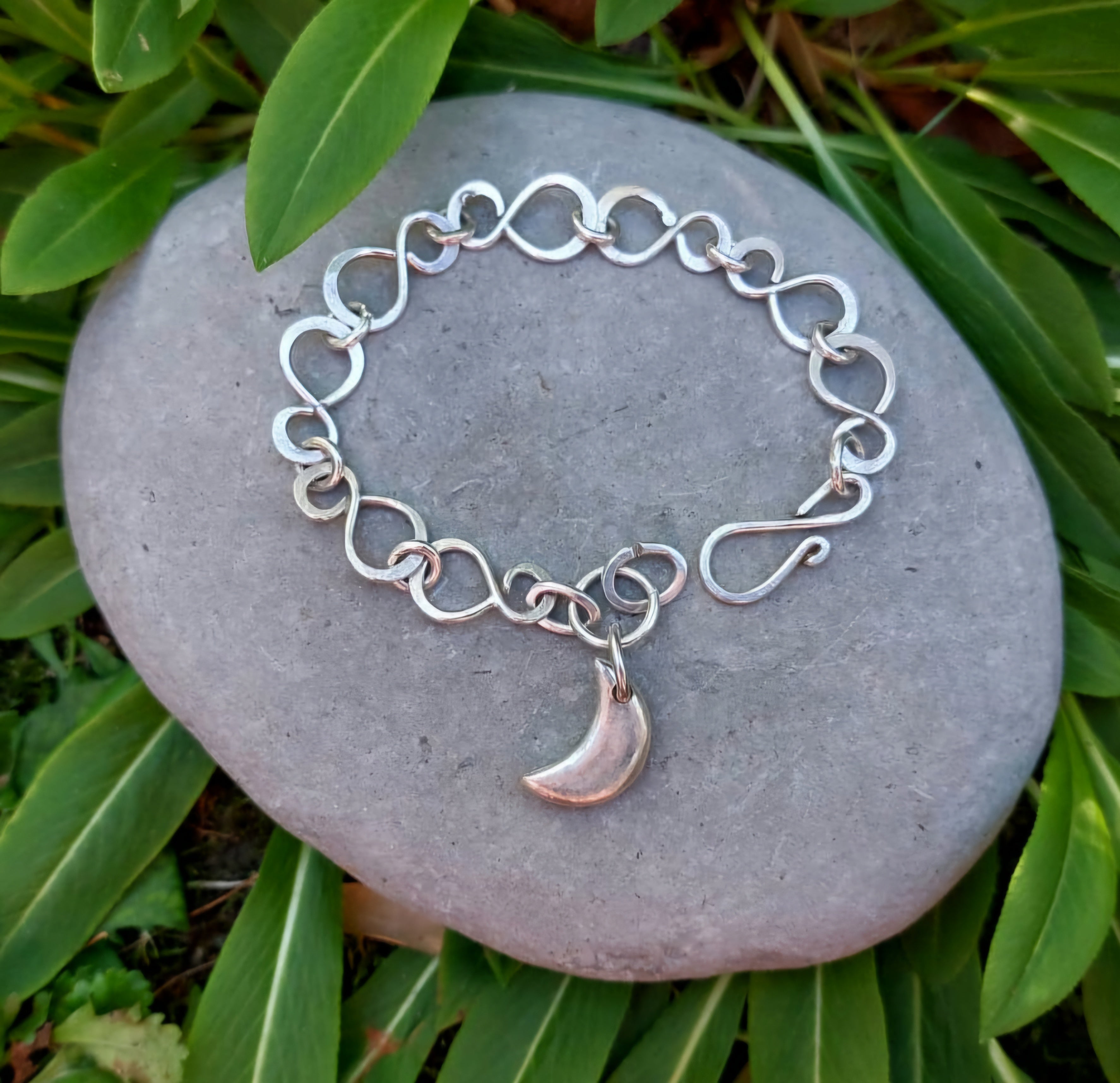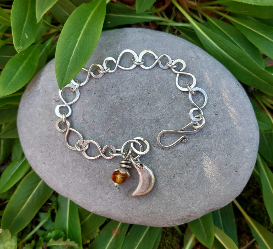 This handmade silver chain is by Michael - it features small infinity symbols, linked and nicely articulated for lovely flow ... It has a good weight, solid but not too heavy, and closes with one of Sue's handmade figure of 8 clasps. Sue's carved moon hangs either on its own, or with an amber and silver droplet.